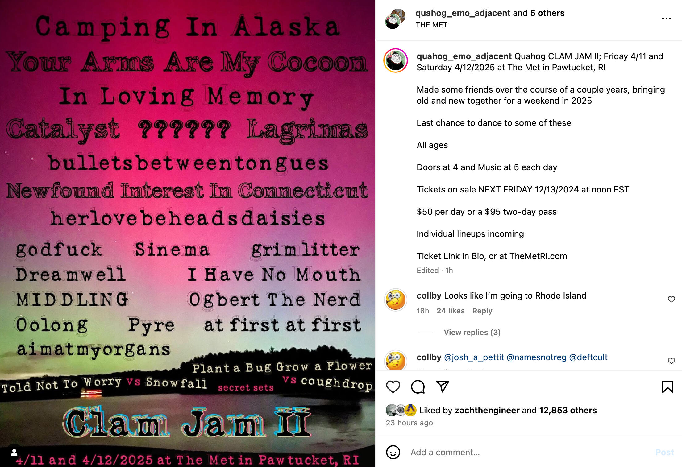 and bands that I miss!!!a lot of these bands here, I've worked with through my record label. Camping In Alaska are some of my best friends, and their manager Ashleigh of Sluicefest. I'm friends with Newfound Interest, godfuck, Oolong, Ogbert The Nerd, and a bunch of other bands on this bill. Your Arms Are My Cocoon even stayed at my apartment when we played a show together so it'd be cool to see those guys again.most importantly, my absolute BEST FRIEND OF ALL TIME colby (pictured in the image, the commenter with the silly emoji profile picture) is planning on going, and I can NOT miss out on meeting him and so many other friends.not to toot my own horn as well but my project idialedyournumber is a little popular with these folks on the bill, i could probably find a bunch of new opportunities at this event.with all love and respect, I will bawl my eyes out and become a hermit if I don't get to go to this. i'm praying to the emo gods--please let me in....BECAUSE YOU DON'T GET IT!!! I NEED TO HEAR GET IN THE ROBOT, BIKE COPS (OGBERT), LITERALLY ANY OOLONG SONG ESPECIALLY WELCOME TO DESTINY ISLAND, I NEED TO HEAR END OF EVERYTHING BY GODFUCK, I NEED TO HEAR CAMPING IN ALASKA'S WHOLE SETLIST, I NEED TO HEAR LIKE SO MANY SONGS THESE BANDS HAVE WRITTEN!!!!!!!!!!!!!!!!!!!!!!!!so hopefully this helps you understand.